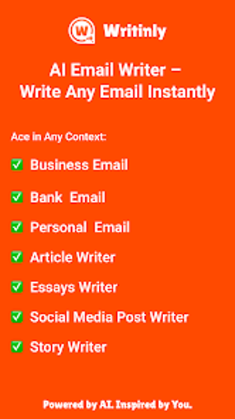 Writinly: AI Writing Assistant is een handige applicatie voor Android die gebruikers helpt bij het genereren van verschillende soorten teksten, van e-mails tot essays. Met functies zoals een e-mailgenerator, applicatieschrijver en contentmaker, kunnen gebruikers snel en eenvoudig teksten produceren zonder veel tijd te verspillen. Deze applicatie is ideaal voor studenten, werkende professionals, freelancers en ondernemers die regelmatig teksten moeten schrijven.